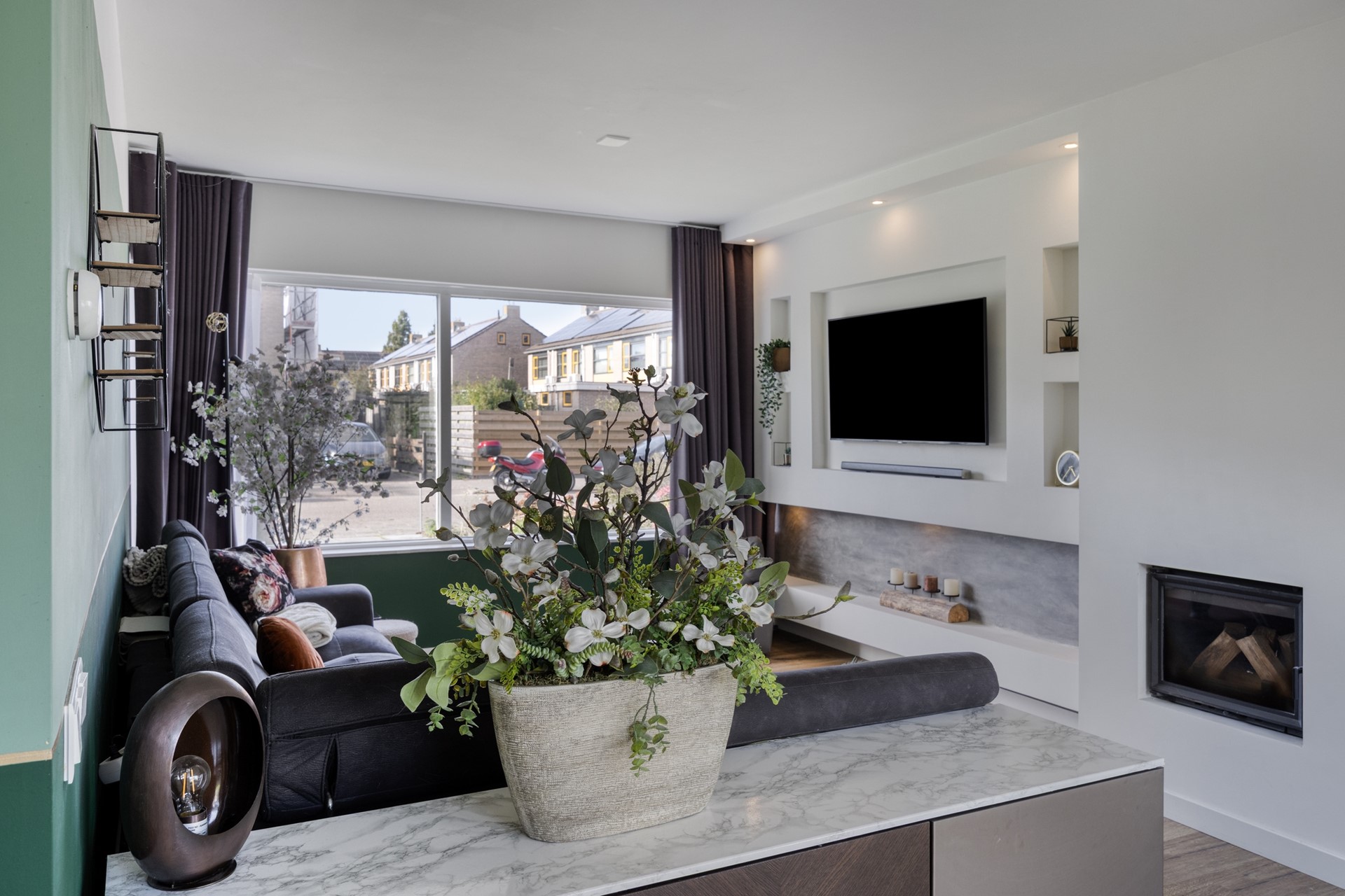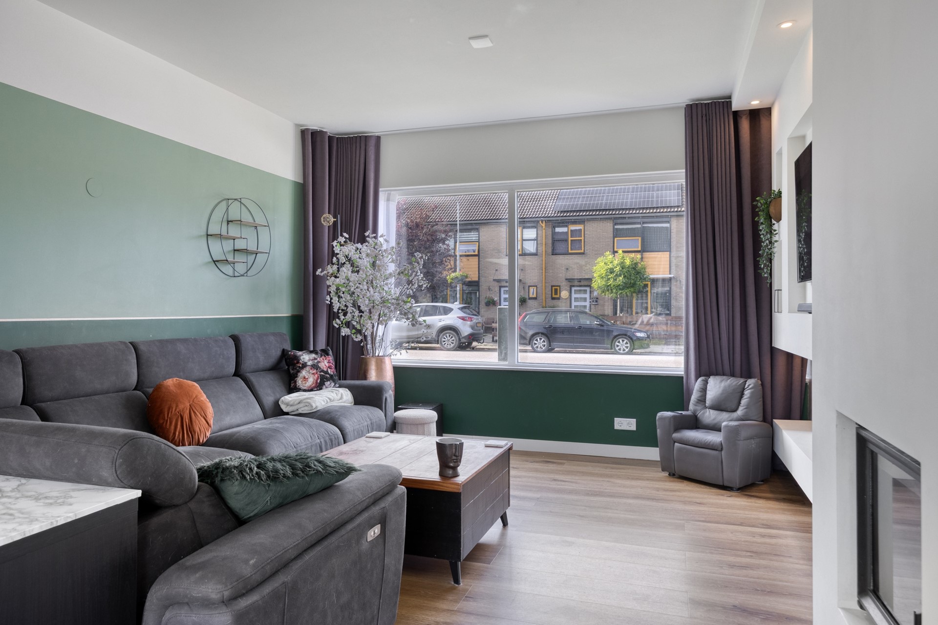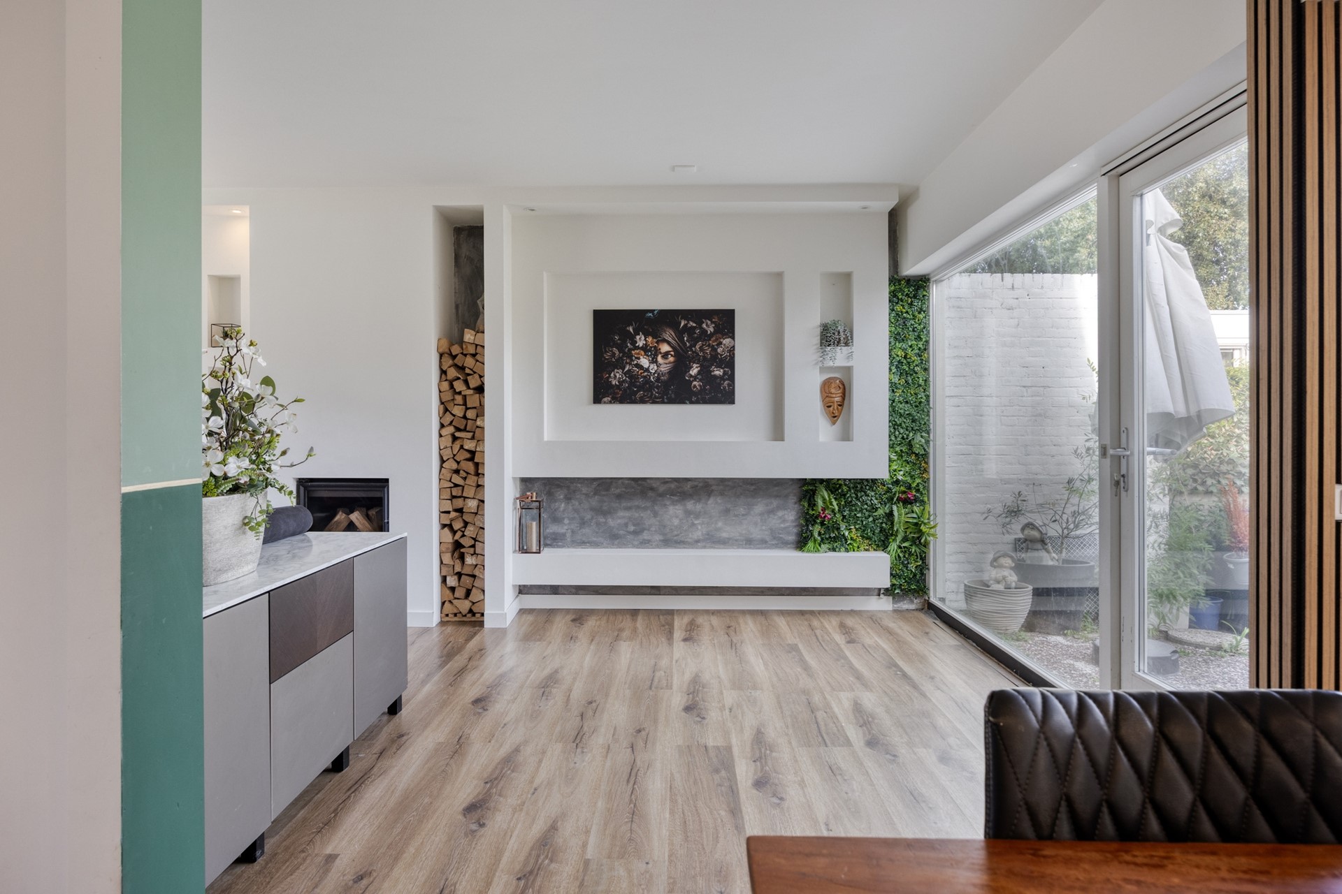 -Luxe, lichte woonkamer met cinema wall, open haard en schuifpui
